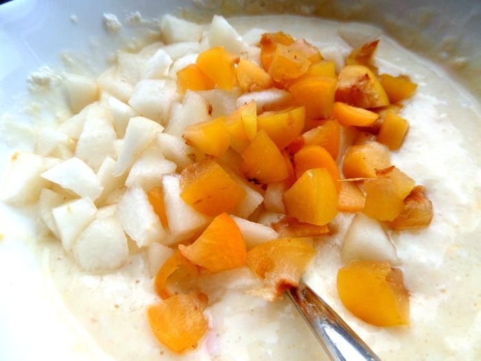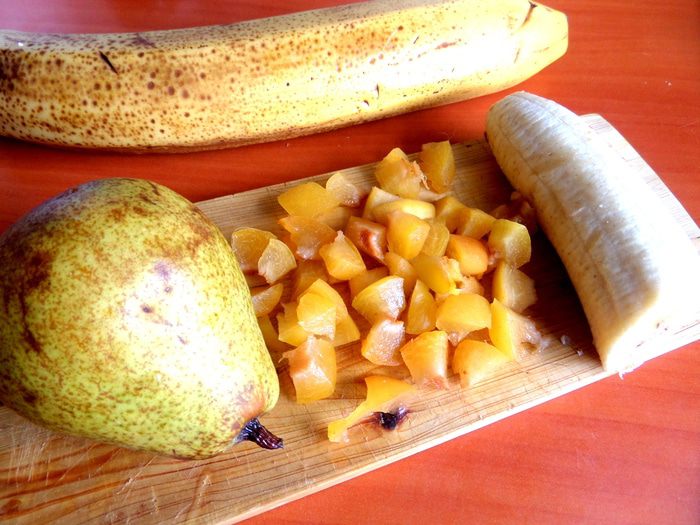 Для начинки берём всего понемножку: абрикосины,банан,грушу без кожицы мелко нарежем.