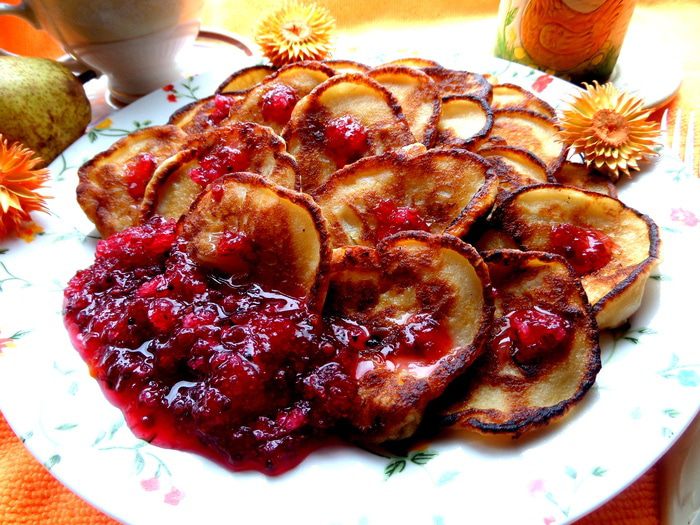Сегодня у нас на завтрак вкусные оладьи с начинкой из разнообразных фруктов! Так как фрукты сладкие,подаём с кисленьким вареньем из красной смородины для вкусового баланса)))