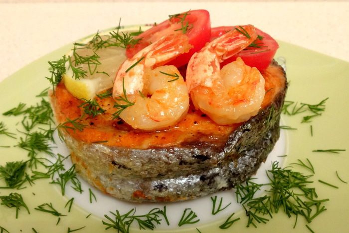 Выложить медальон на плоскую тарелку. Сверху положить по две креветки, дольке помидора и лимона. Обильно посыпать мелко нарезанным укропом.