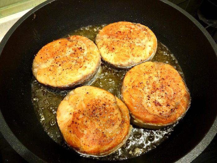 Разогреть в сковороде оливковое масло и обжарить наши медальончики с обеих сторон до румяной корочки. Выложить на бумажное полотенце. На том же масле обжарить креветки (8 штук).
