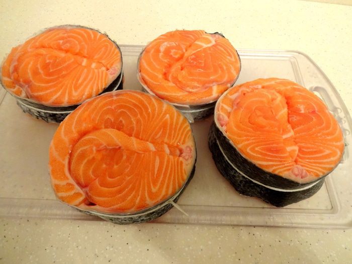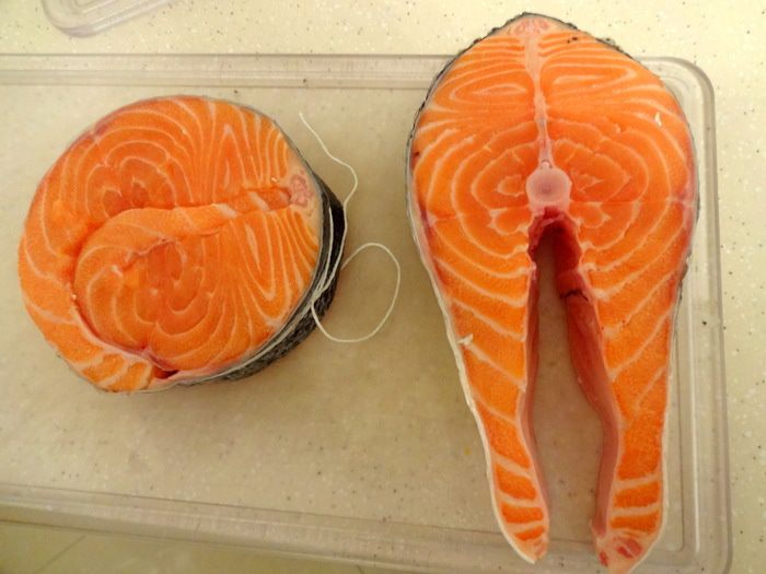 Часть тушки лосося помыть, обсушить и разделить на стейки весом по 200-250 грамм. У меня получилось 4. Можно купить уже нарезанные стейки.