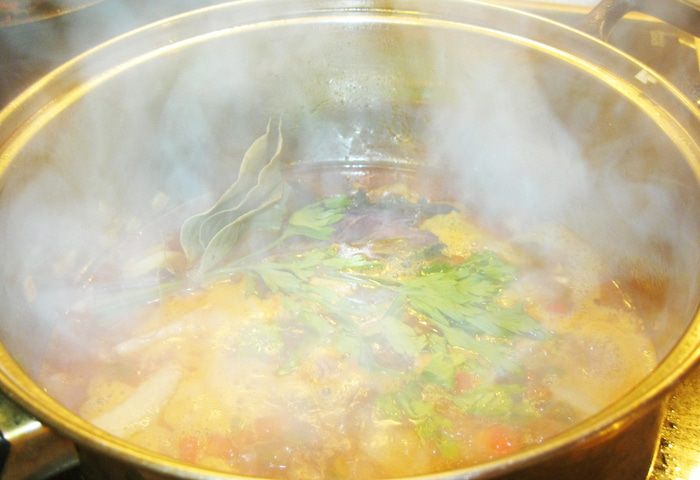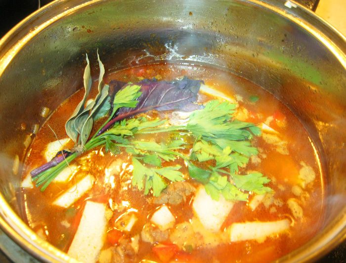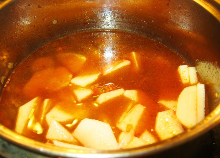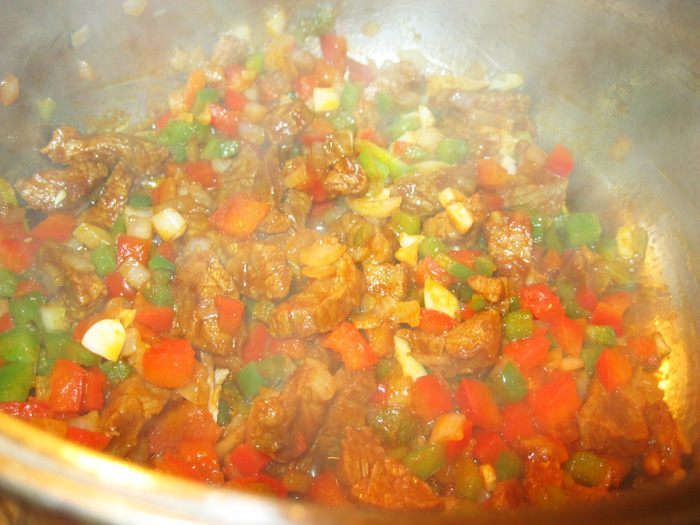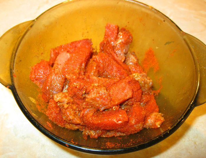 Правда, чоризо у нас редкость. Вместо нее я взял сто грамм свинины, нарезал брусочком, смешал с двумя столовыми ложками бальзамического уксуса, чайной ложкой острого чили, двумя чайными ложками сладкого кайенского перца и немного обжарил в минимальном количестве растительного масла.