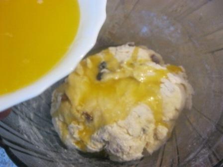 Перед выпечкой смазать либо взбитым яйцом, либо холодным молоком.