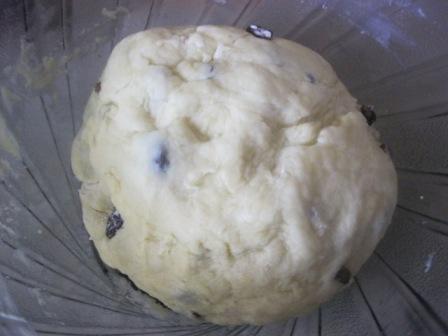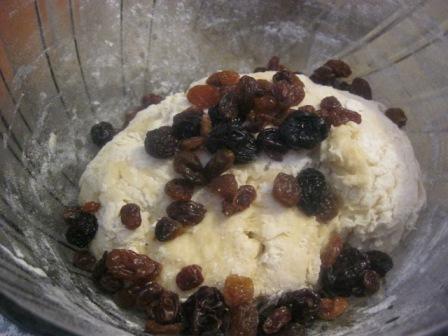 Подмешать к тесту, размешать так, чтобы изюм распределился равномерно.