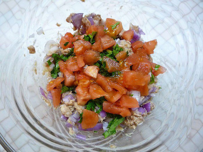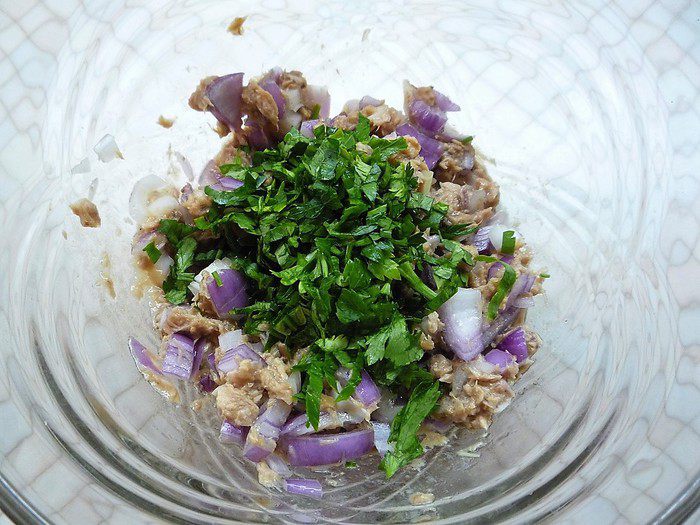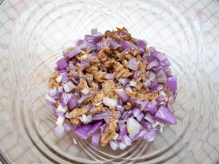 Смешиваем в чашке лук с консервированным тунцом (я использовала тунец измельченный для салата).