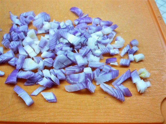 Красную луковицу мелко нарезаем.