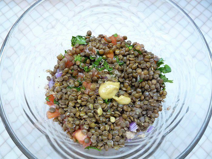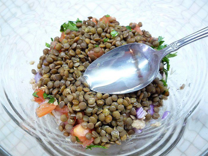 Вкусный и сытный салатик, не сложный в приготовлении, обязательно понравится любителям рыбных салатов. К тому же он богат витаминами и белком, который содержится в чечевице и тунце.
