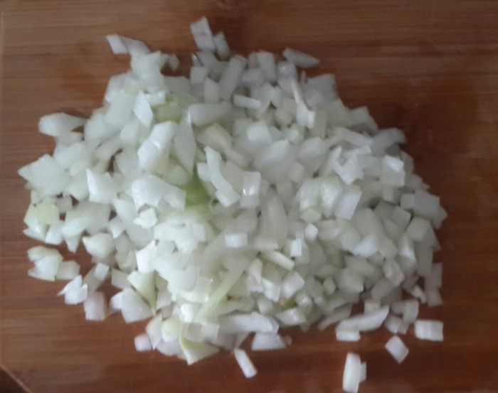 Нарезаем половину луковицы и обжариваем ее до золотистого цвета.