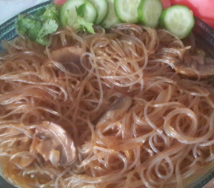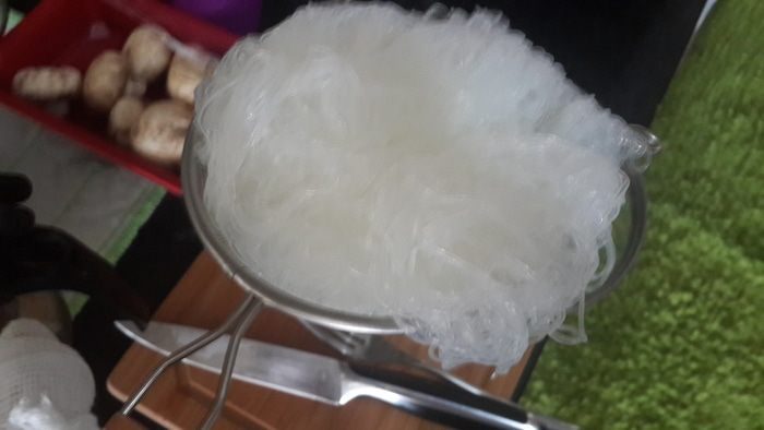Отвариваем стеклянную лапшу до готовности, откидываем на дуршлаг, промываем холодной водой. Отставляем в сторону.