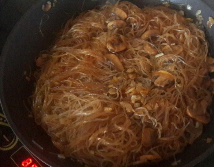 Кладем лапшу к грибам, добавляем соусы, хорошо перемешиваем и тушим еще пару минут.
