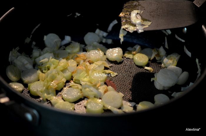 На горячей сковороде растопить сливочное масло и оливковое, обжарить лук-порей 10 мин. Добавить карри, перемешать.