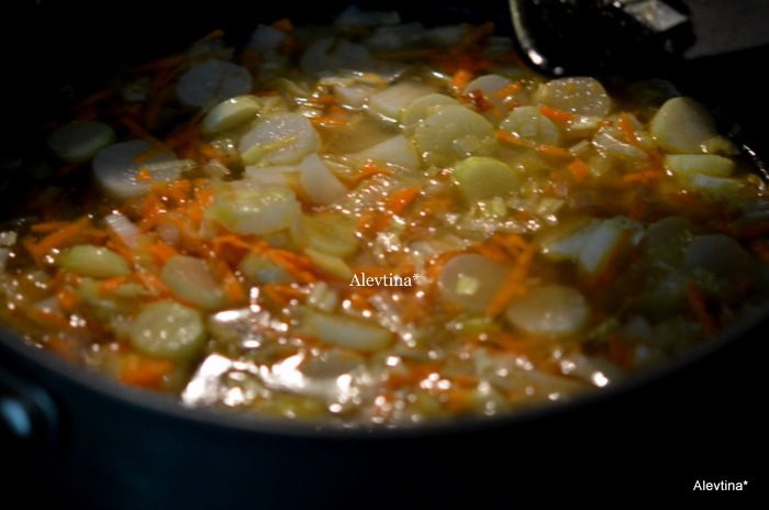 Добавить овощи: порезанный картофель мелко, морковь на терке, бульон. Закрыть крышкой. Готовить еще 10 мин. или до готовности картофеля. Добавить сливки 300 мл., перемешать. Посолить и поперчить. Содержимое взбить в блендаре по желанию.