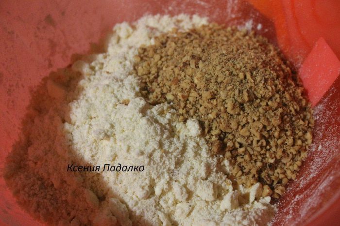 Охлажденное масло перетереть руками с мукой в крошку. Добавить сахар, соль и орехи. Перемешать.