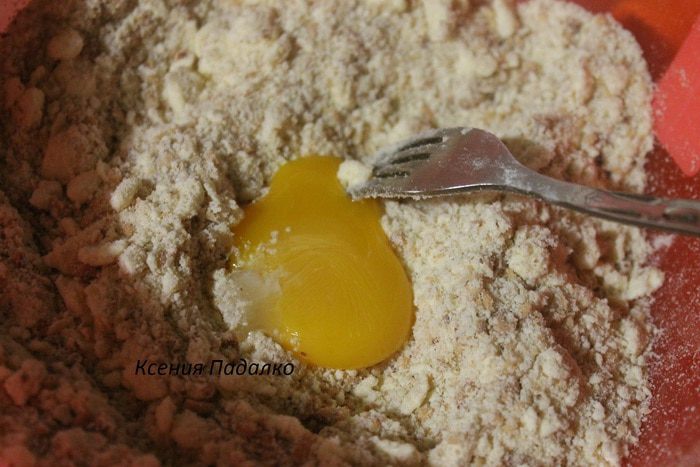 К полученной смеси добавляем желток и перемешиваем руками. Затем добавляет ложку ледяной воды и опять перемешиваем, если тесто не желает собираться в ком, то добавляем еще одну ложку воды.