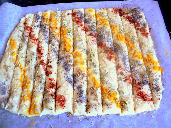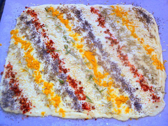 Раскатать тесто в пласт толщиной 0.5 см и смазать взбитым яйцом. Посыпать любимыми специями и семенами, чередуя их. Состав специй и семян можно варьировать по своему вкусу. Оставить для подъема теста на 20-30 минут.