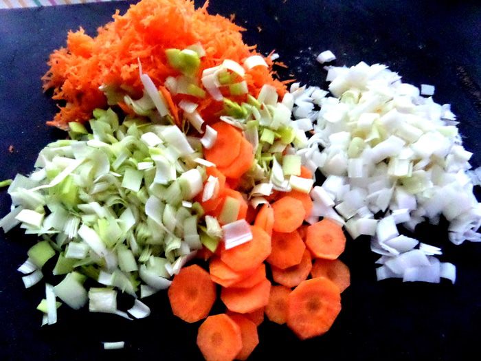 Порей мелко нарезать.