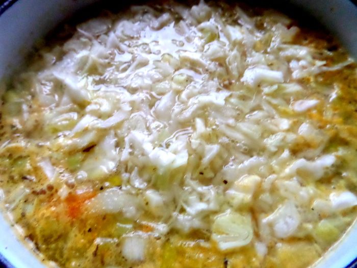 Засыпаем овощи в бульон.