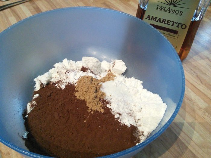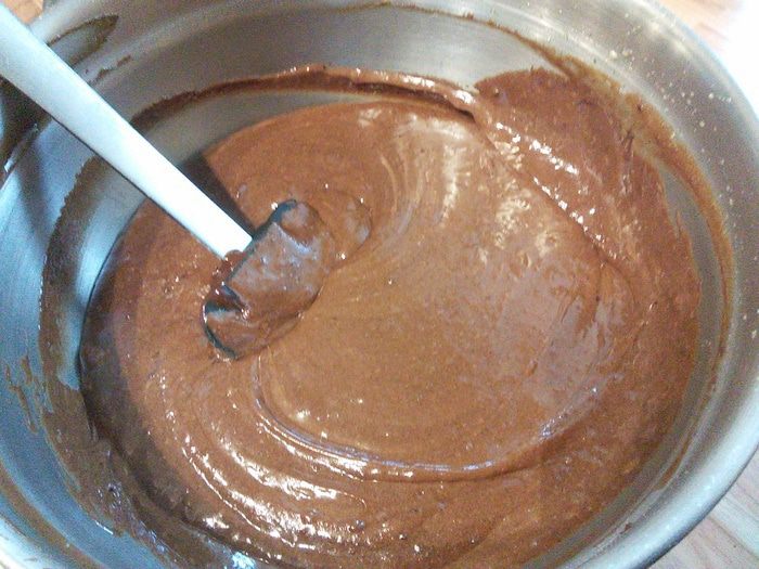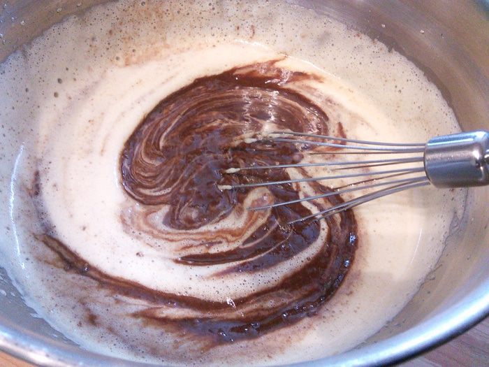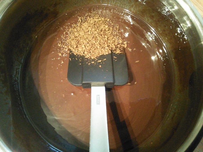 Растворить шоколад с маслом на медленном огне, иногда помешивать, чтобы шоколад не подгорел. Когда все полностью растает, добавить растворимый кофе, тщательно размешать и немного остудить. Я брала горький и молочный шоколад в равных количествах, поэтому в следующем шаге полностью исключила обычный сахар и ограничилась только коричневым.