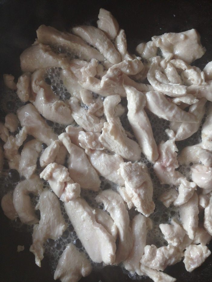 Куриное филе нарезаем тонкими полосками и обжариваем на растительном масле до румяного цвета. Остужаем.