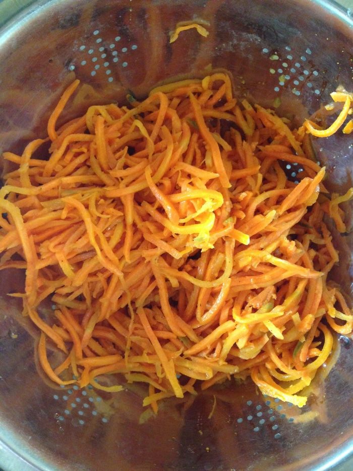 Тем временем морковь сцеживаем от лишней жидкости.