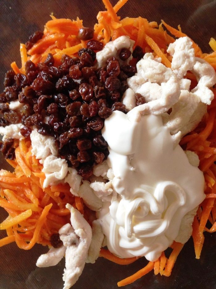 Смешиваем морковь, куриное филе, изюм и заправляем сметаной. Или по желанию майонезом. По необходимости солим (я не солю).