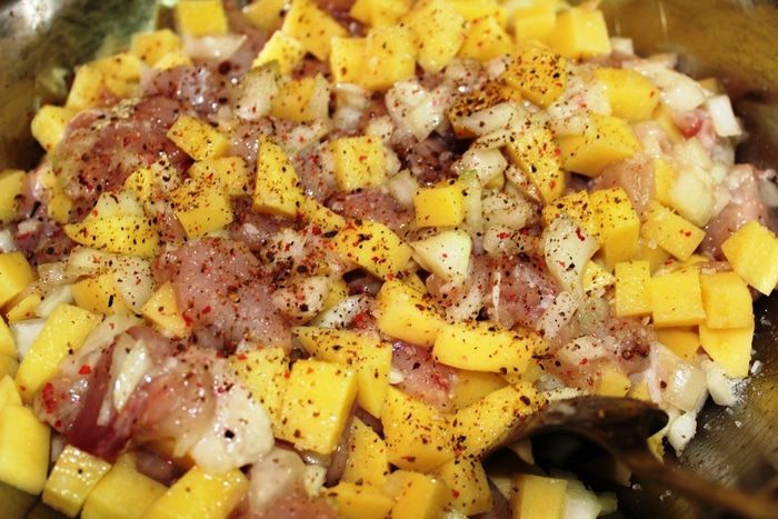 Смешать курицу, картофель и лук, добавить соль и свежемолотый перец ( у меня была смесь перцев с преобладанием розового перца...он очень ароматный). Я позволила себе добавить еще 0,5 ч.л. сухой горчицы для более яркого вкуса (это по желанию). Начинке долго стоять не стоит, надо сразу же начинать готовить элеши (иначе появится сок). Кстати, я прежде все взвесила и у меня получилась следующая пропорция: мясо - 600 грамм, картофель - 400 грамм, лук - 200 грамм (это после очистки и нарезки)
