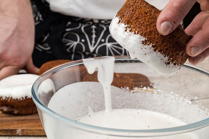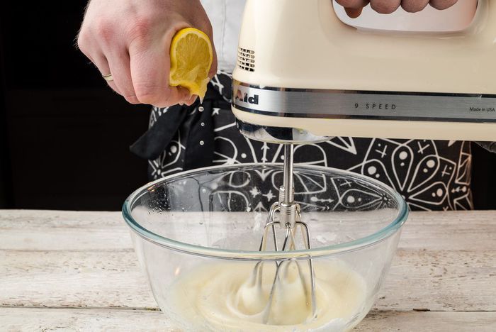 Приготовим глазурь. Взбить белок, добавить сахарную пудру и взбить добела, добавляя лимонный сок.