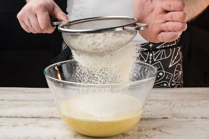 Просеять муку в массу и все хорошо перемешать.