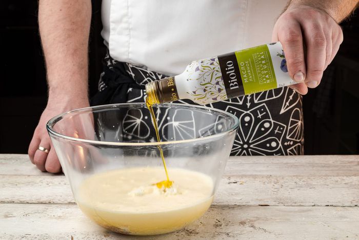 Добавить взбитые яйца, соль, ванилин, льняное масло Biolio и все хорошо перемешать.