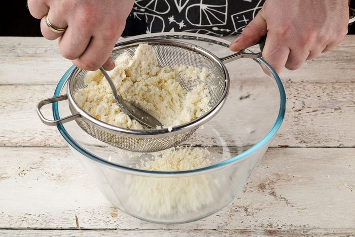 Протереть через сито творог.