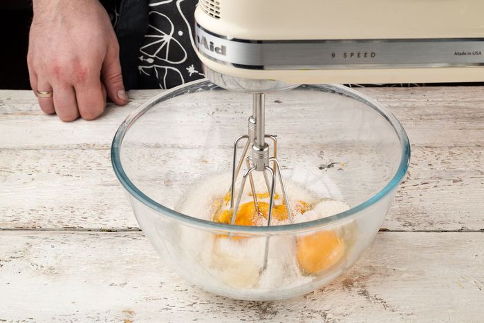 Готовим тесто. 2 яйца и желток хорошо взбить с сахаром.