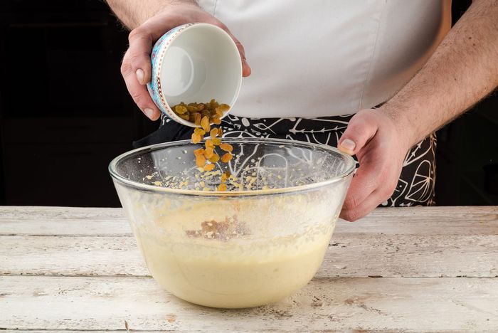 Промыть изюм, просушить. Добавить изюм в тесто, перемешать, чтобы он распределился равномерно. Поставить тесто в теплое место подходить на час.