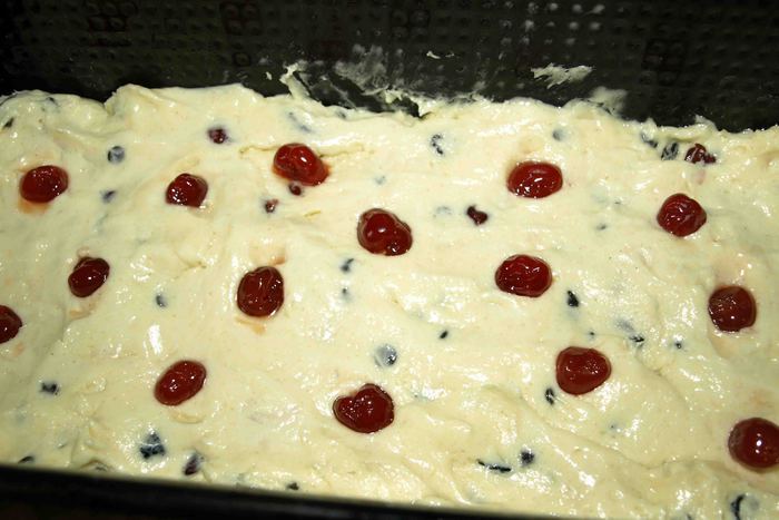 Перекладываем тесто в форму (у меня форма-буханка на 900г). Разравниваем тесто, сверху выкладываем отложенные ягоды вишни. Отправляем в разогретую заранее до 170 градусов духовку и выпекаем 1 час до пробы на сухую спицу (бамбуковую палочку).