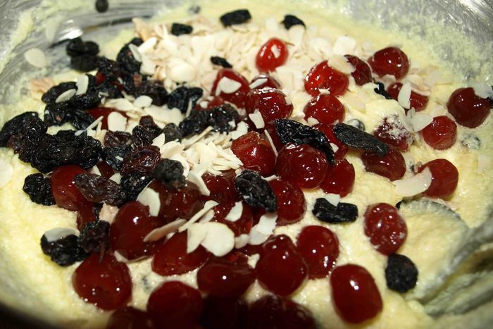 Добавляем просеянную муку с разрыхлителем, замешиваемым тесто равномерно распределяя ягоды.