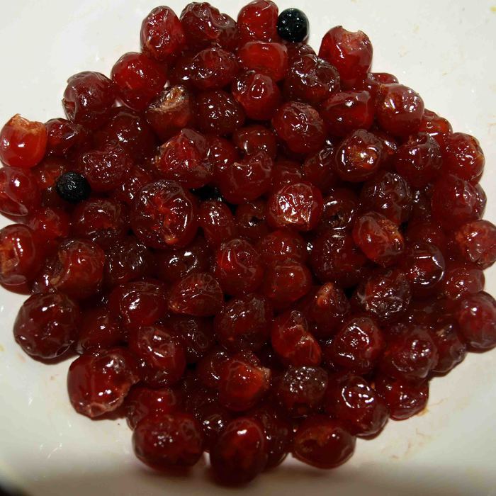 Замачиваем вишню в коньяке (или заливаем горячим чаем). Несколько штук ягод откладываем для украшения.