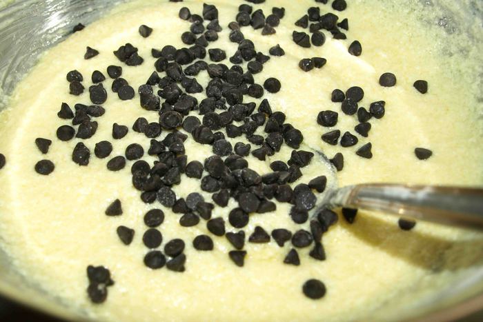 Масло взбиваем с сахаром в пышную, светлую массу. Постепенно вводим по одному яйцу, тщательно взбивая. Добавляем капли шоколада, перемешиваем.