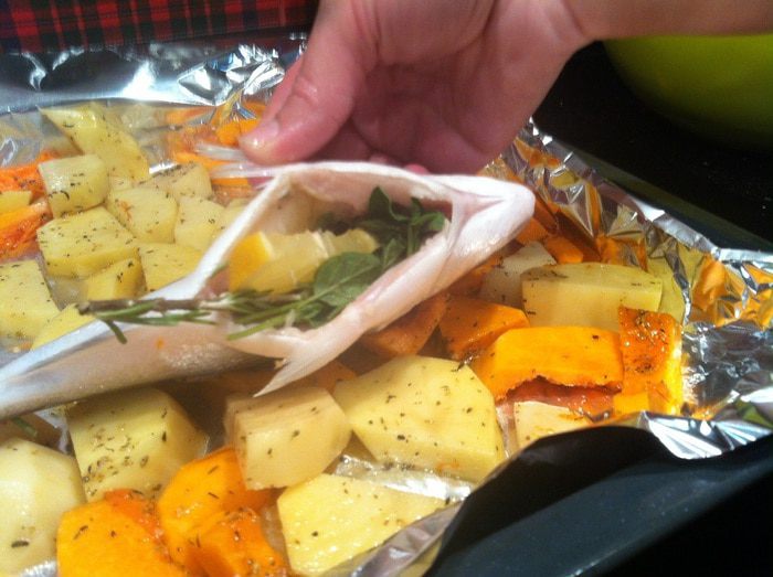 Духовку разогрейте до 170 градусов. Почистите картофель и тыкву. У тыквы удалите семена. Порежьте крупными ломтиками. Приправьте тимьяном, орегано, посолите, добавьте оливковое масло и перемешайте.