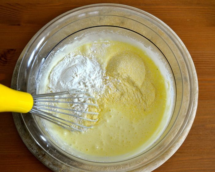 Продолжая взбивать, добавить крахмал и оба вида муки...