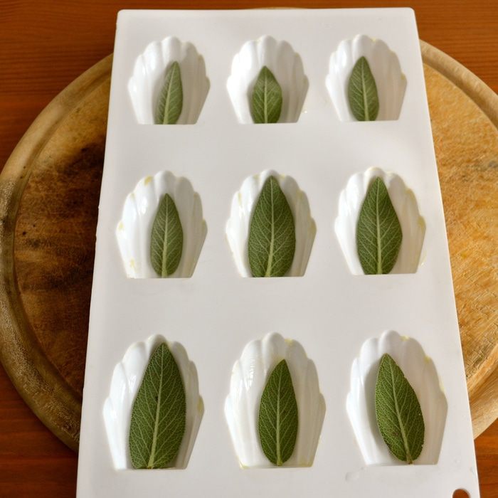Формочки для мадлен смазать слегка масло и присыпать мукой. Листики шалфея предварительно вымыть и осушить. Выложить по одному листику в каждую лунку для печенья.