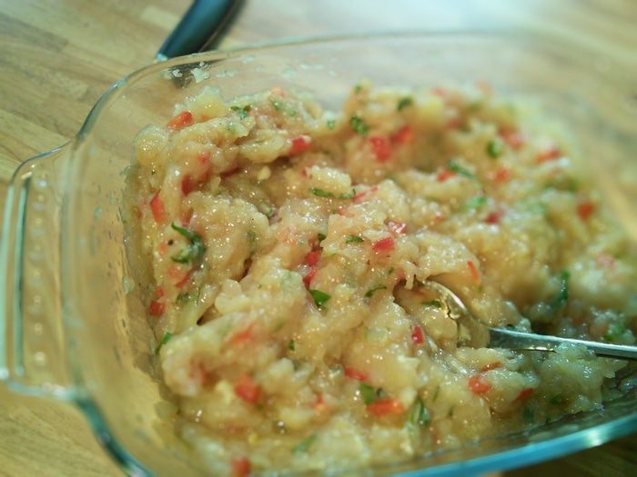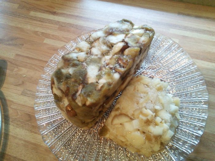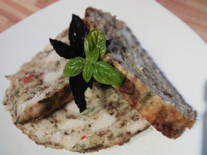 Все просто: из филе делаем фарш, я оставила 1/3 часть мяса не перемолотой, а порезала его на маленькие кусочки. Фарш смешать с мясом, яйцом, порезанным на кусочки перцем чили и шалфеем, можно добавить любую другую зелень по вкусу. Грибы нарезать пластинками, пожарить на масле, в конце добавить нарезанный кольцами порей, припустить и ещё горячим добавить в фарш. Все хорошенечко посолить, поперчить и добавить 1/2 ч. л. соды и 2-3 ст. л. тёплой воды. Сода заменяет в изделиях из фарша хлеб, не даёт сокам выделиться из мяса. Из фарша сформировать любую форму я предала ему форму батона(можно выпекать в фоме), но фарш отлично держится как в сыром так и готовом виде. Выпекать в разогретой до 190° духовке около 45 мин.