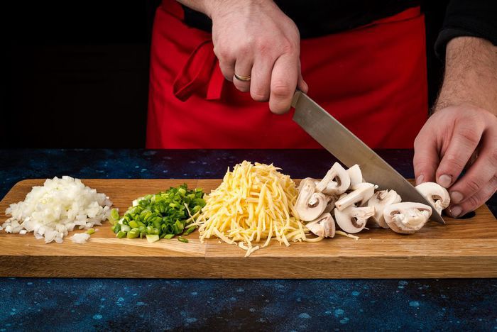 Нарежьте репчатый и зеленый лук, натрите сыр на крупной терке. Грибы нарежьте средними по величине кубиками.