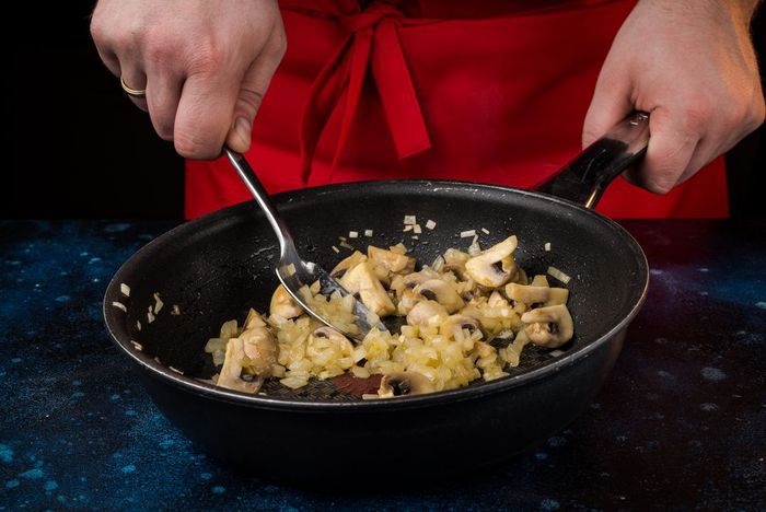 Поджарьте на сливочном масле лук, затем добавьте туда грибы, перемешайте, посолите, поперчите и еще немного потомите. Затем дайте остыть в миске.