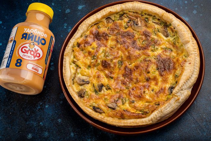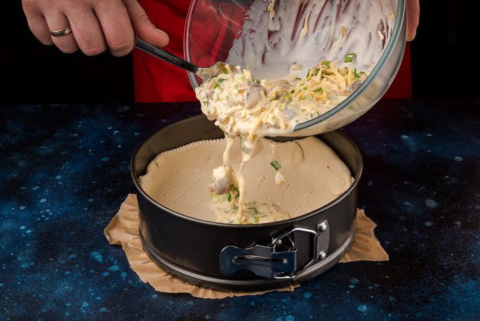 Всю начинку выложите в форму и поставьте киш в духовку выпекаться 30-40 минут.