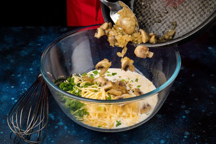В массу добавьте сыр, зеленый лук и обжаренную начинку.