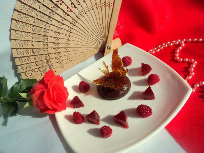 Бонус: десерт по мотивам шоколадного трюфеля с желе из перца и малины от испанского шеф-повара Андриана Кетгласа . Красный сладкий перец завернуть в фольгу и запечь в духовке в течении 40 минут. Остудить не вынимая из фольги, затее очистить от семян и кожицы.