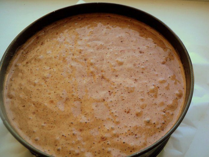 Форму размером 25 см застелить бумагой для выпечки, смазать маслом и вылить тесто. Выпекать при температуре 180°C 50-60 минут (ориентируйтесь на свою духовку). Первые 40 минут духовку не открывать, чтобы бисквит не осел.