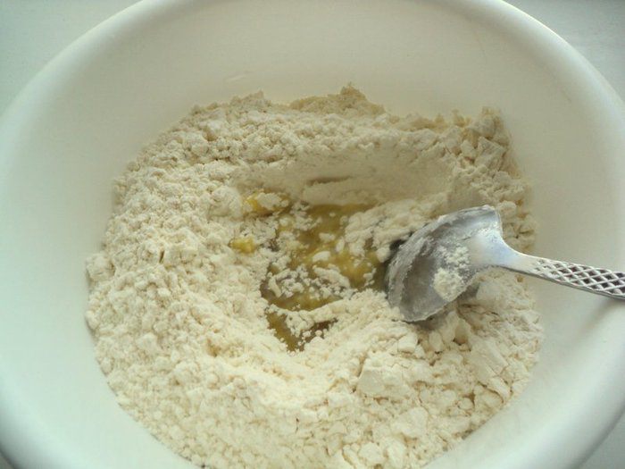 Муку просеять горкой, в центре сделать углубление. Влить растительное масло и слегка перемешать.