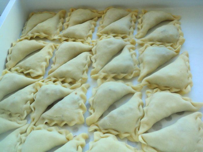 На тесто выложить по 1 ст.ложке начинки и слепить вареник.