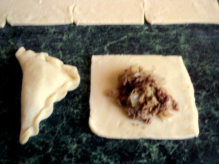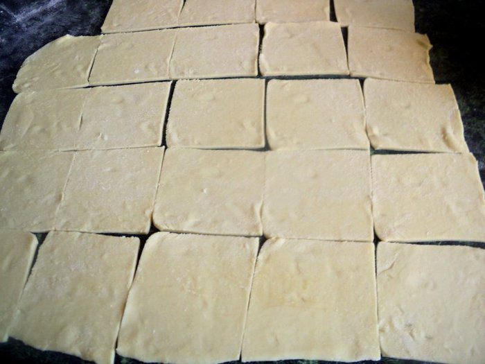Тесто раскатать в пласт толщиной 3 мм и разрезать на квадраты 6х6 см.