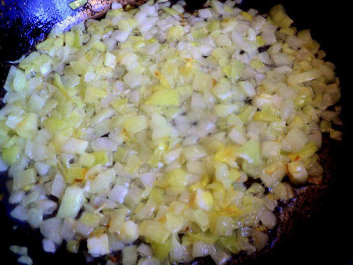Для начинки предварительно отварить говядину и измельчить вареное мясо. Лук мелко порезать и пассировать на сливочном масле до золотистого цвета.